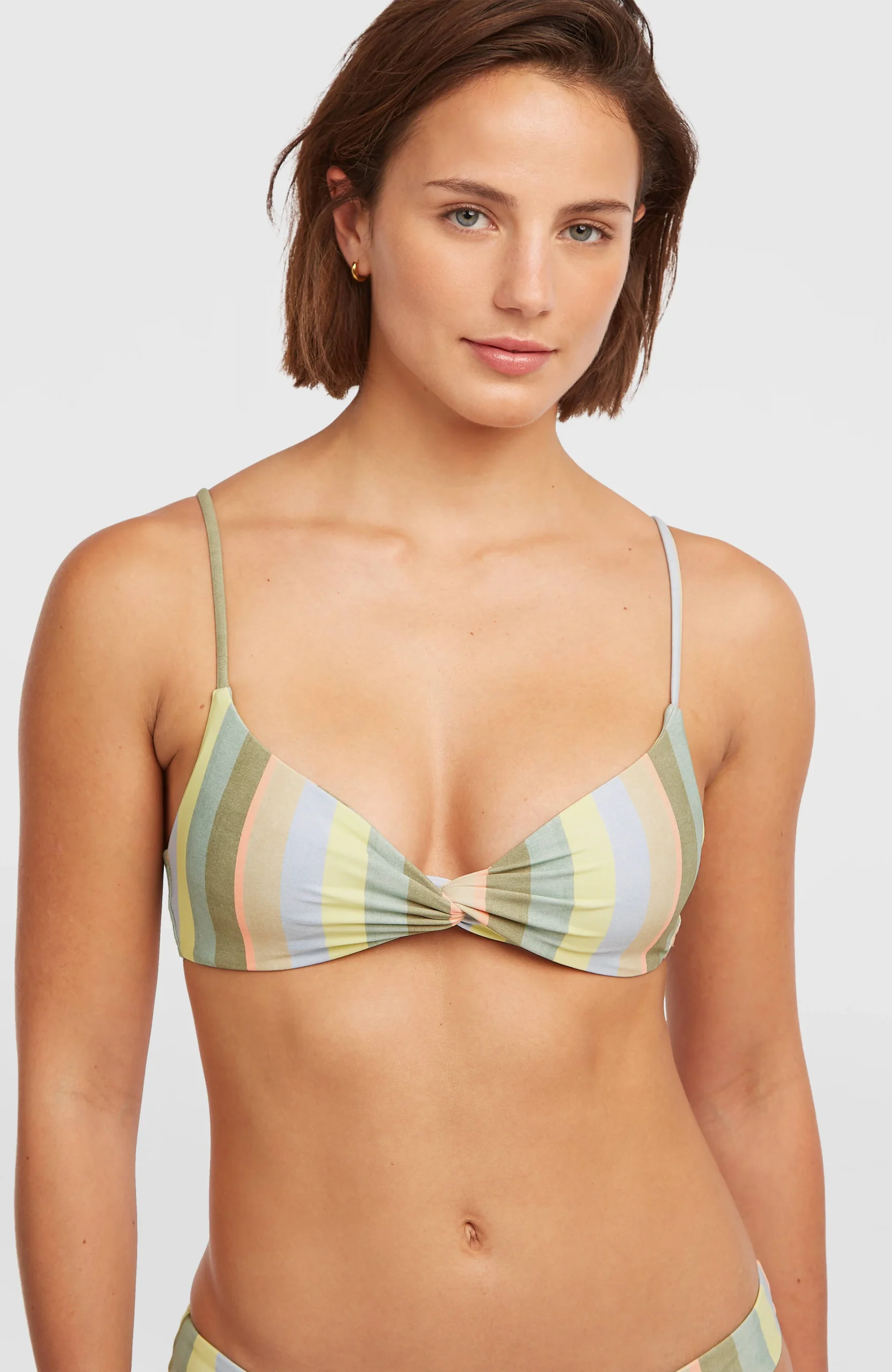 Het topje van de bikiniset Malibu Matira heeft een tijdloos bralettemodel met een gedraaid detail in het midden vooraan. De set bestaat uit een laag broekje met verleidelijke bedekking, en een topje met gemiddelde ondersteuning, gemiddelde bedekking, uitneembare pads in de cups en verstelbare bandjes voor een pasvorm op maat.
